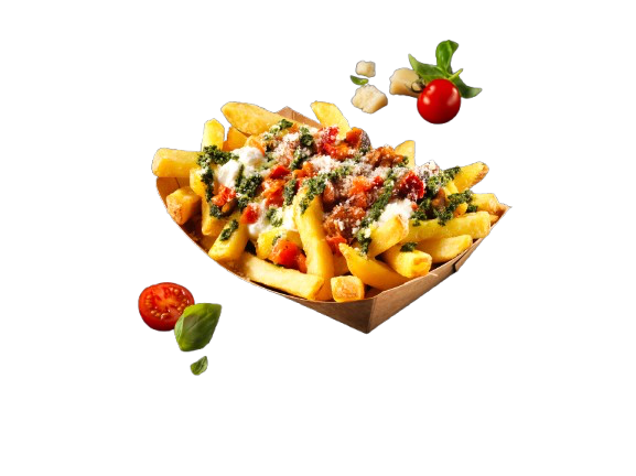 Gewürzte Pommes mit geschnittenen Hähnchenwürstchen und warmem Käse-Dip.