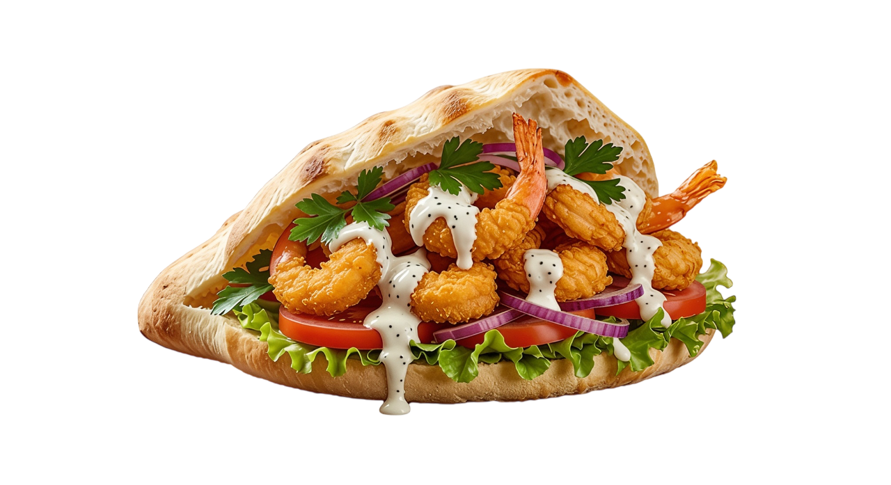 Knusprig frittierte Garnelen mit frischem Gemüse und cremiger weißer Soße im weichen Dönerbrot.