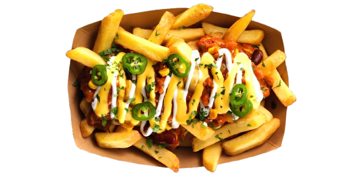 Pommes mit Olivenstücken, würzigem Käse und leichter Kräutersoße oder Pesto.